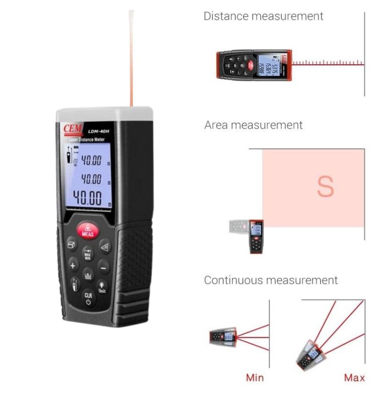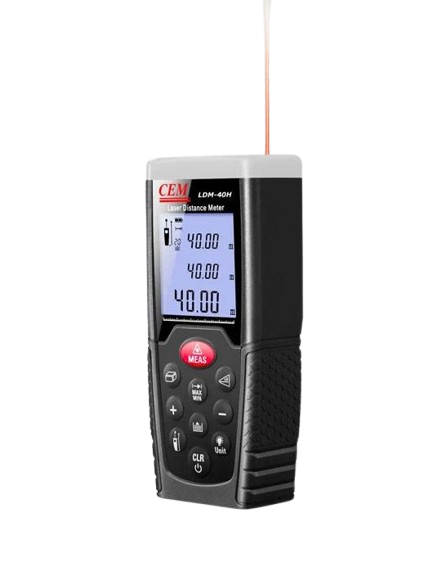 Máy đo khoảng cách laser CEM LDM-40H sử dụng tia laser để đo khoảng cách giữa hai điểm một cách nhanh chóng và chính xác. Chỉ với một thao tác bấm nút, người dùng có thể nhận được kết quả đo trong vài giây. Máy có phạm vi đo từ 0.05 đến 40 mét với sai số chỉ 1,5mm. Nhờ công nghệ hiện đại, thiết bị này đang dần thay thế thước dây truyền thống trong nhiều lĩnh vực.